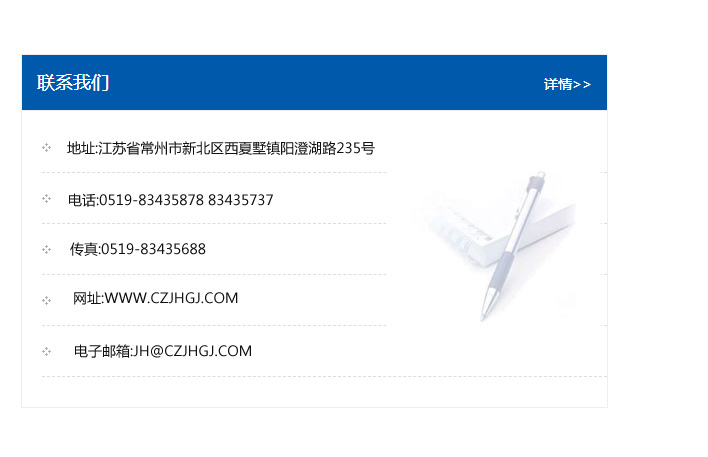 地址:常州市新北區友邦商務大廈1幢16、17層  電話:0519-85101652  傳真:0519-85112595  郵編:213022  網址:www.cz-jiayue_cn.mshdb.com  郵箱:xiajifengaa@163.com